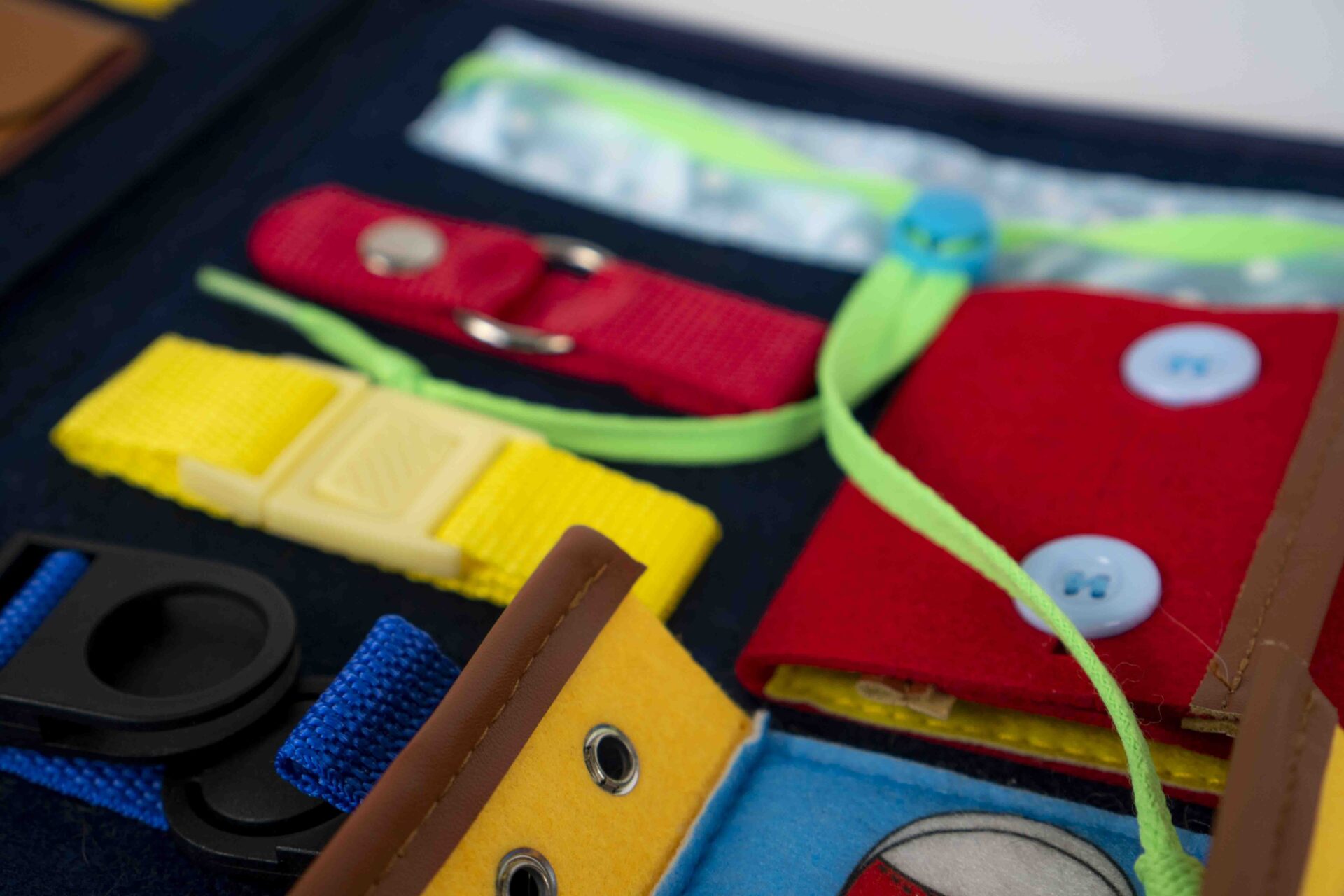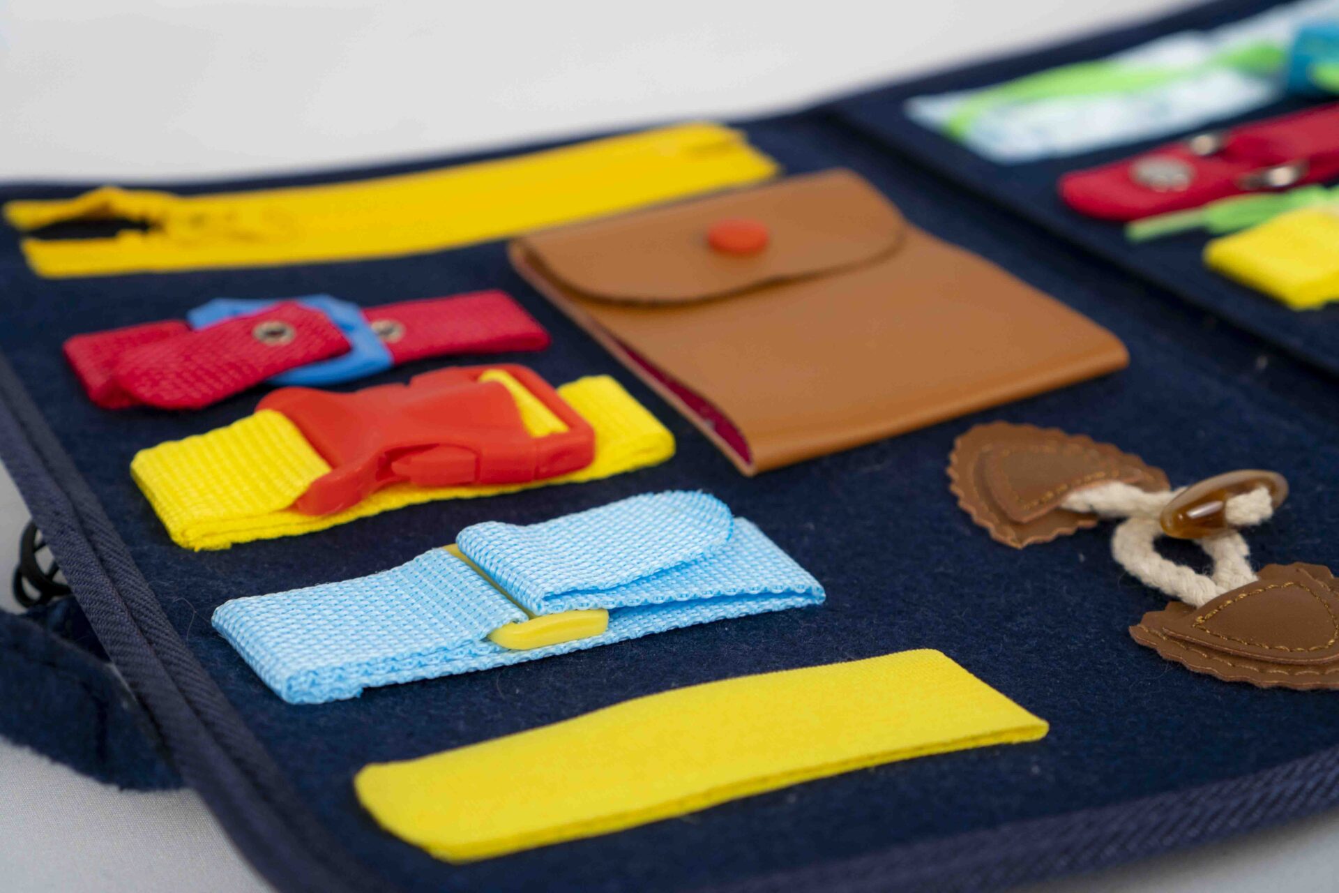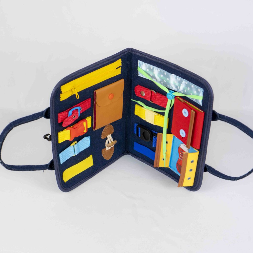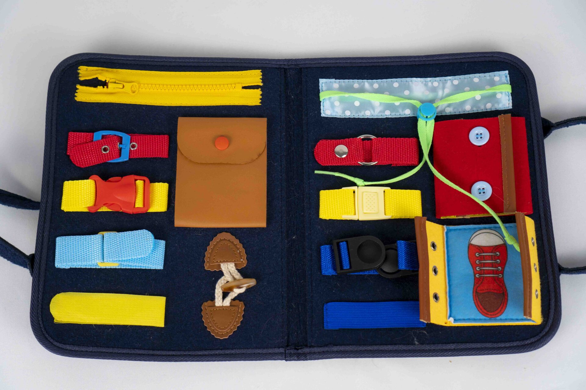 A soft, portable activity board filled with zippers, buckles, buttons, laces, and snaps for little hands to explore. Designed like a small briefcase, it helps children practice everyday dressing skills while keeping them engaged at home or on the go.