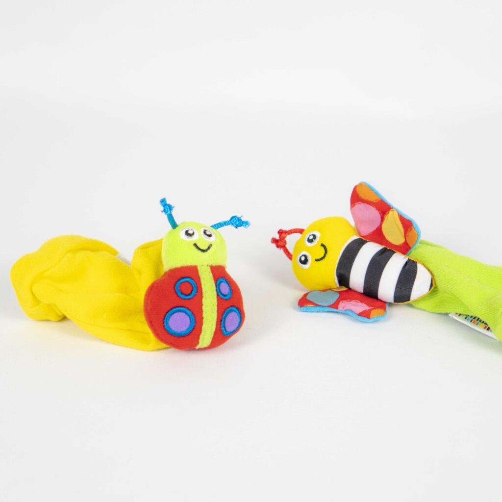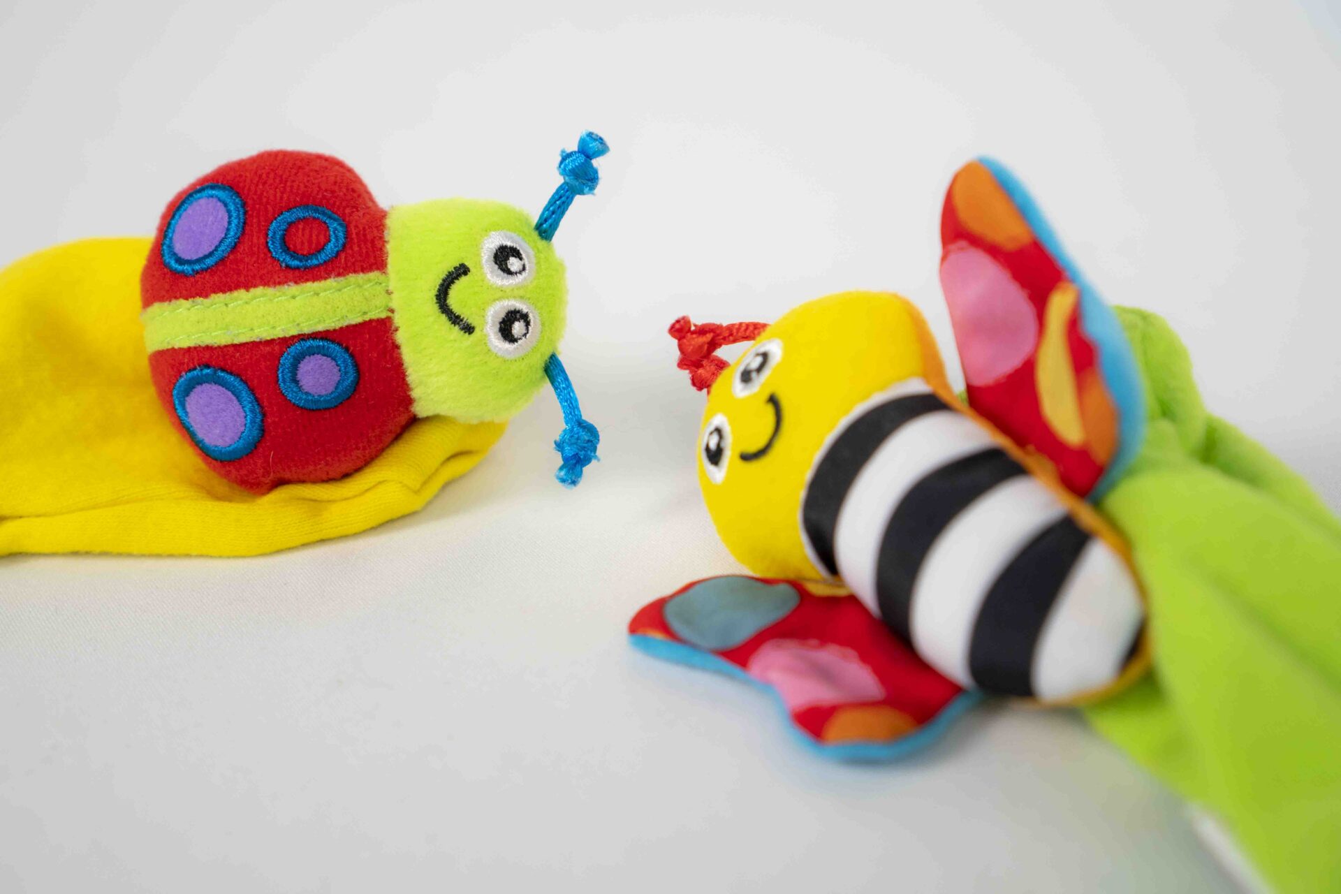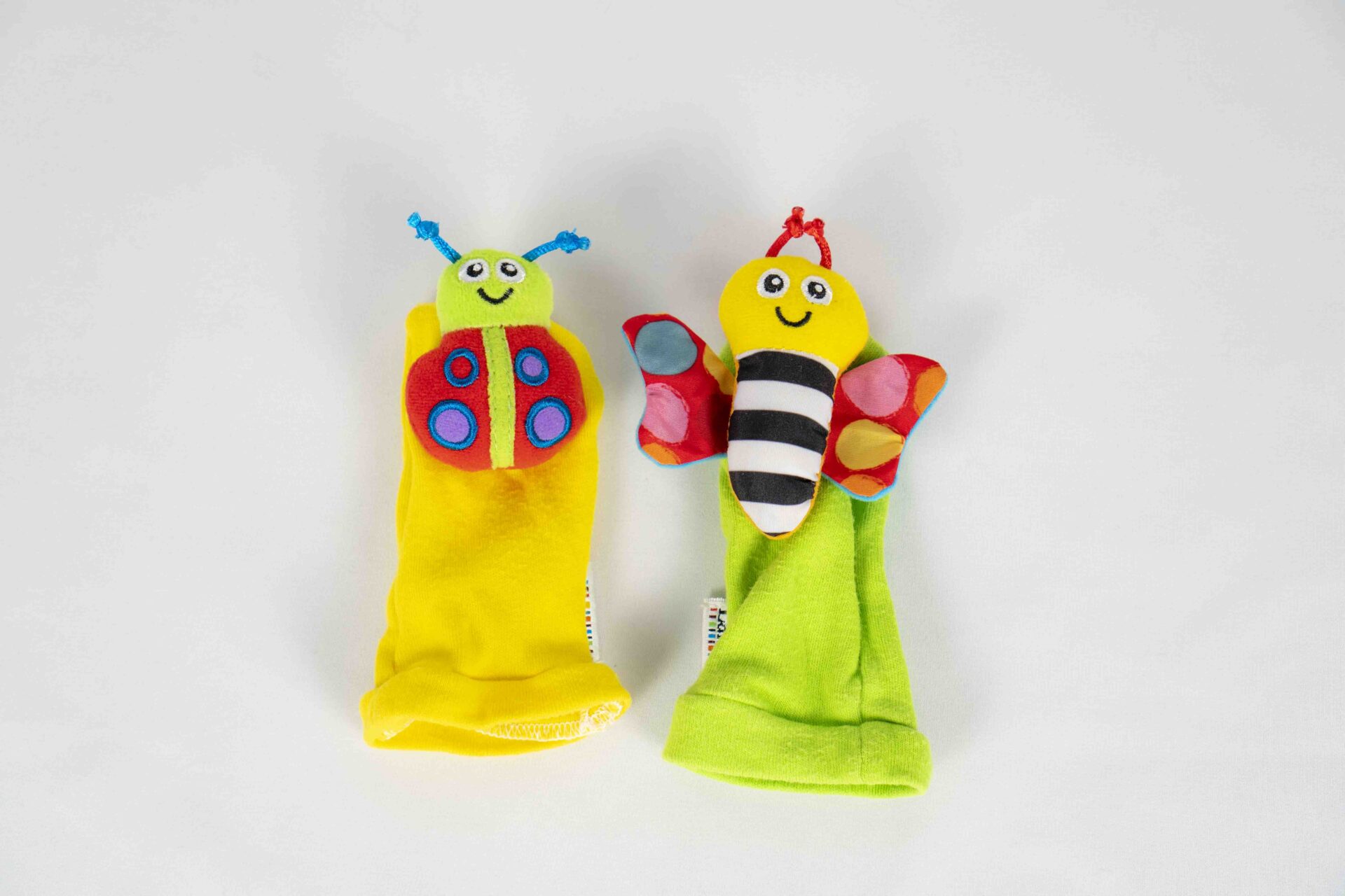 Two colourful baby sock puppets that babies can wear on their feet or hands, encouraging kicking and grasping as the lady bug and bee rattle. The play can be extended to toddlers, who can wear them on their hands to create fun, imaginative stories of their own.