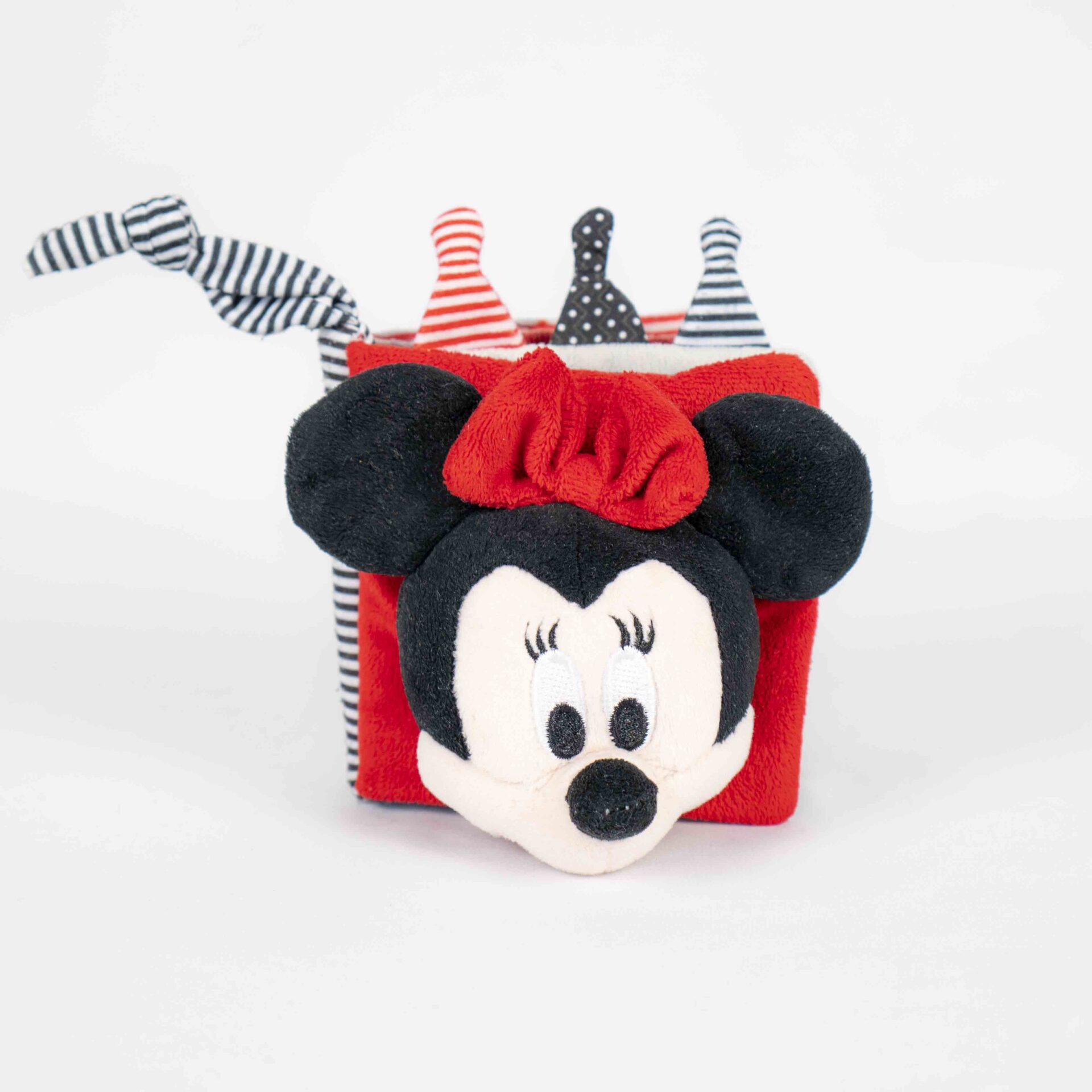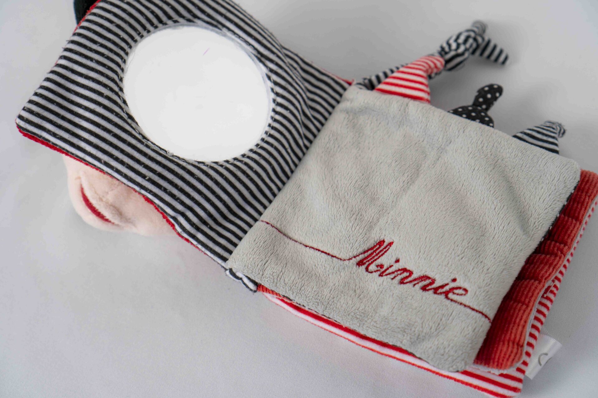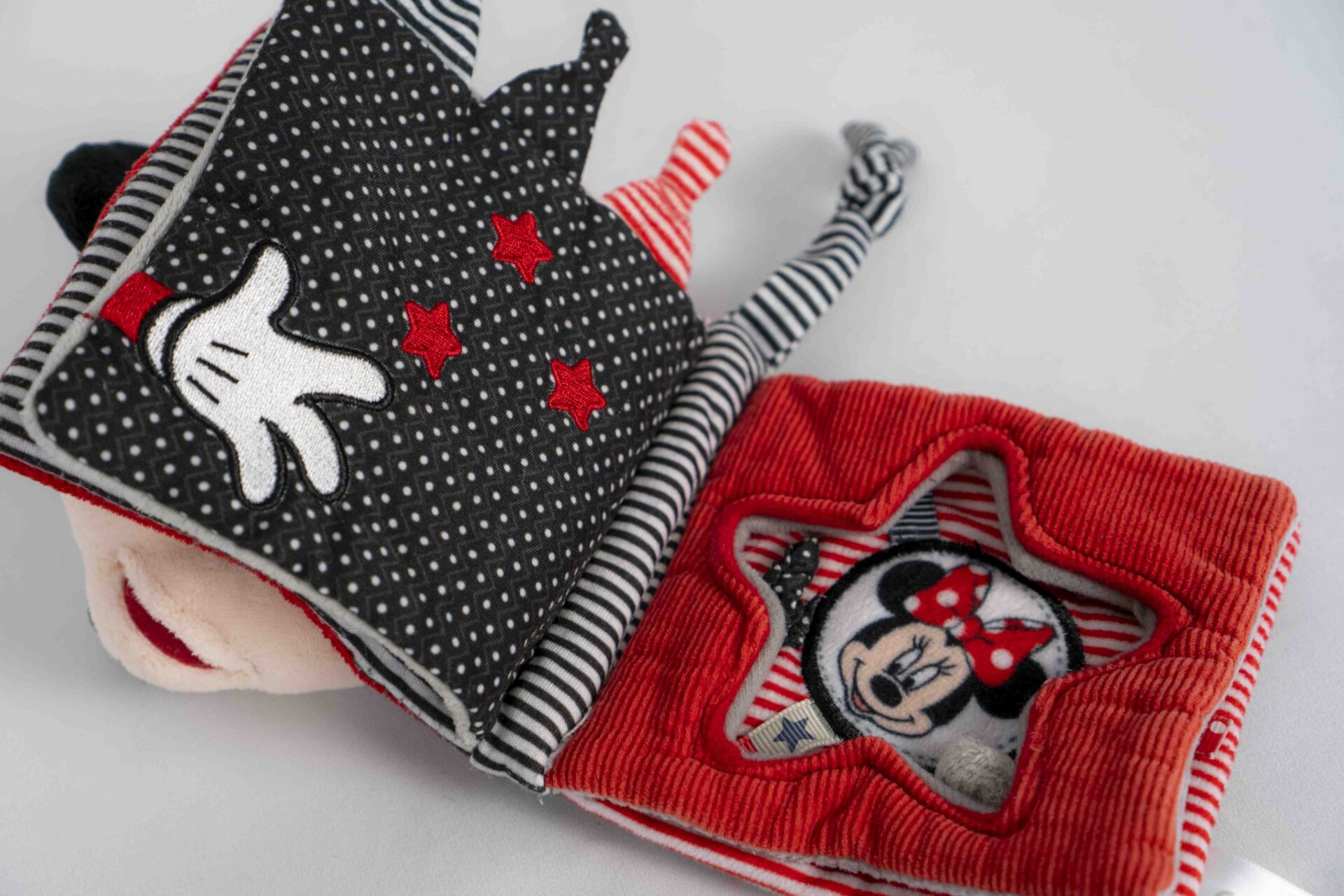 Made of soft, textured fabrics in red, black, white, and striped patterns, this book is gentle and safe for babies to explore. Inside, the pages offer interactive elements such as crinkly textures, embroidered details, a peekaboo mirror, and cut-out shapes, encouraging sensory play and fine motor development. The knotted fabric tabs on the edges add extra tactile fun for little hands to grab and chew.