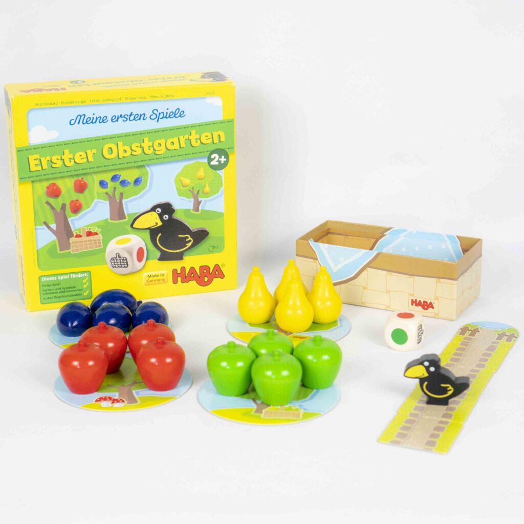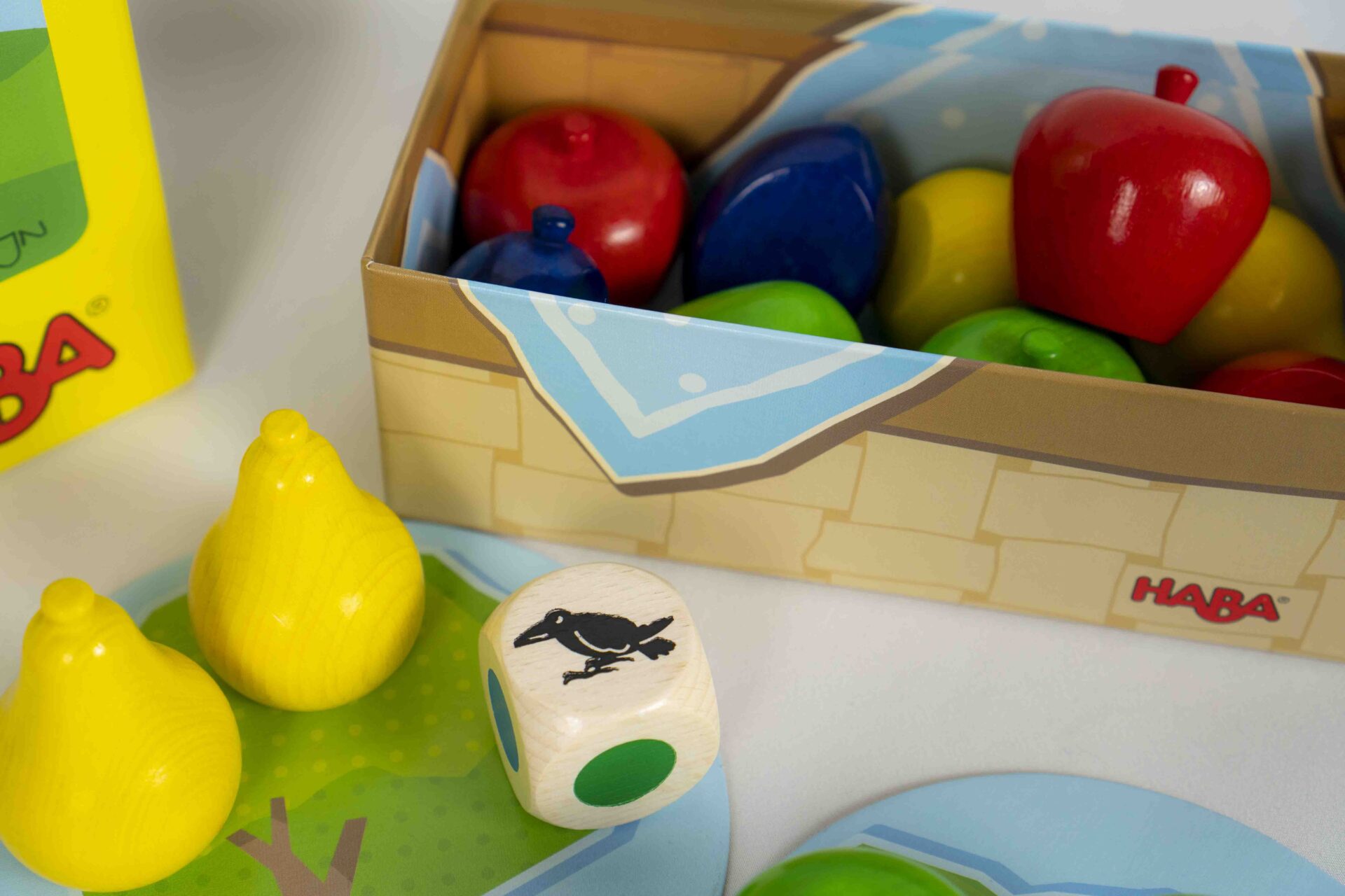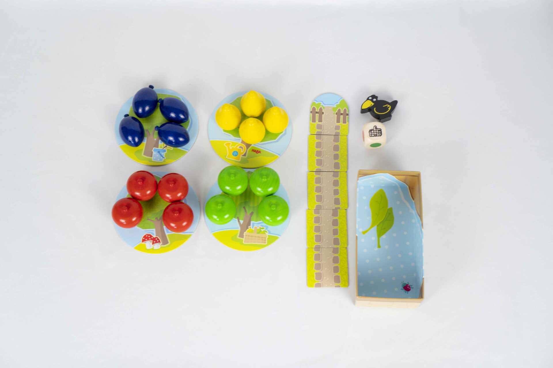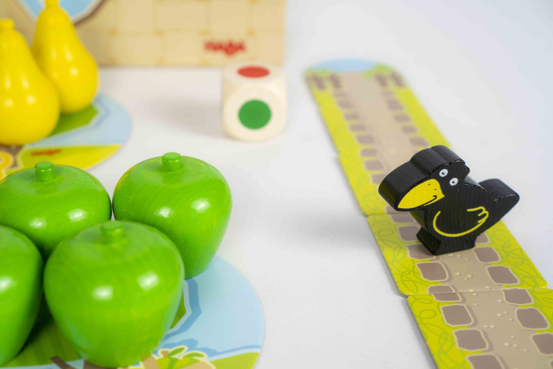 A cooperative board game for toddlers (2+)! Families work together to harvest colourful wooden fruits before the raven reaches the orchard! Encourages teamwork, colour recognition, and counting skills.