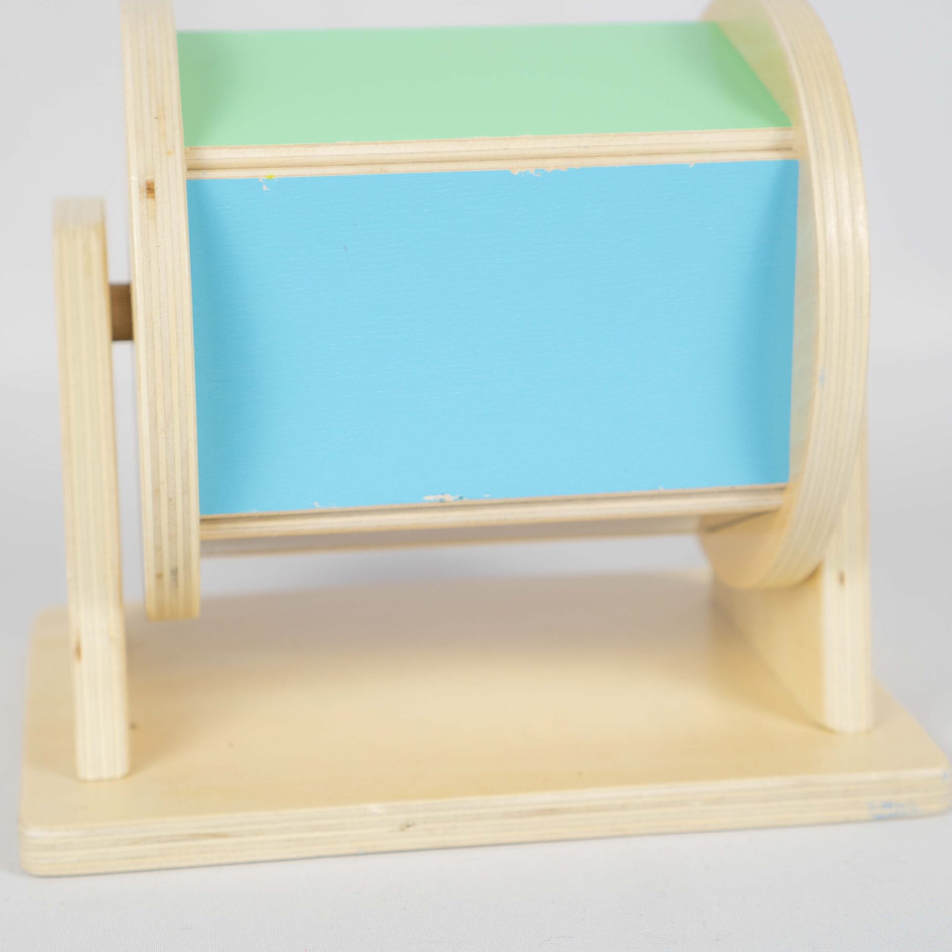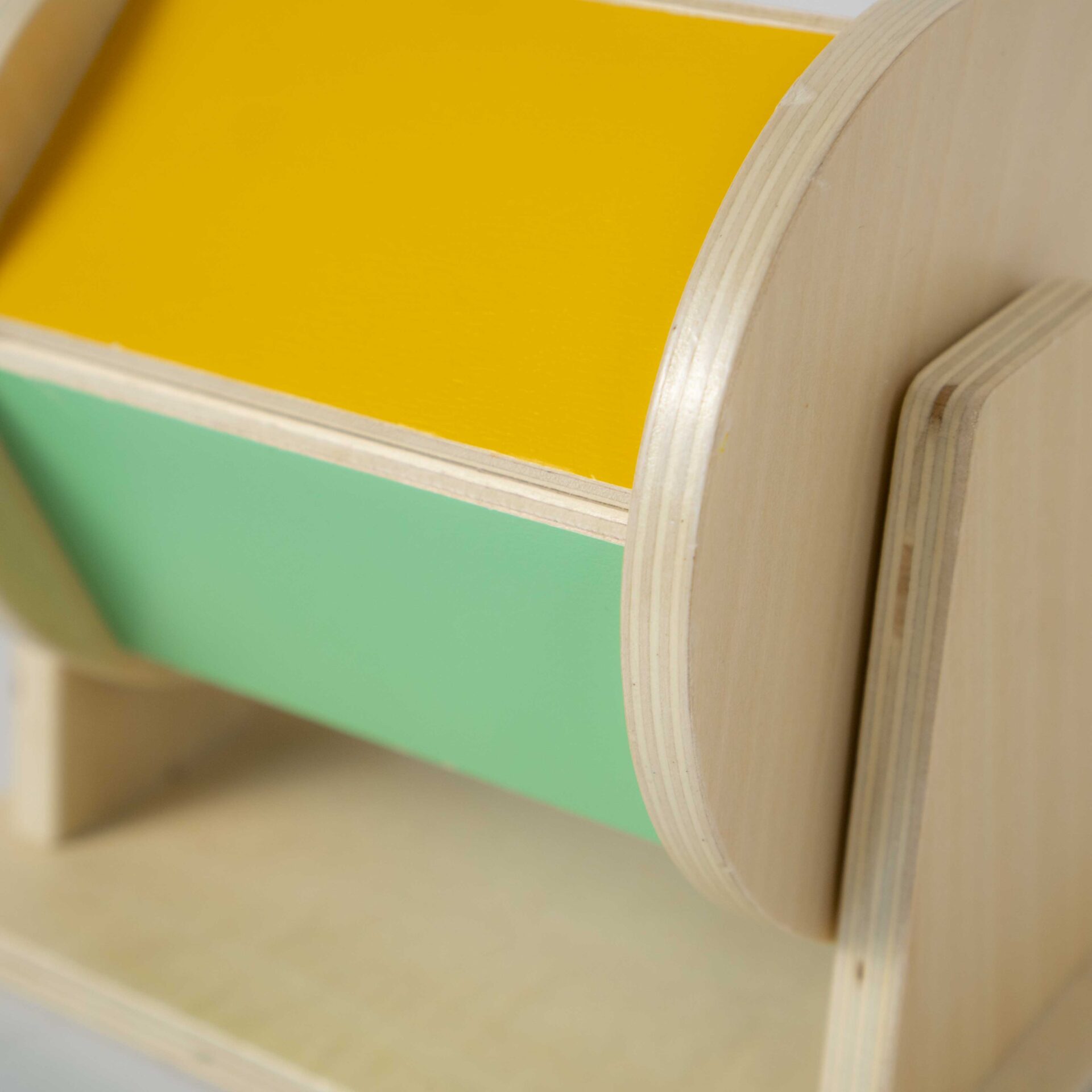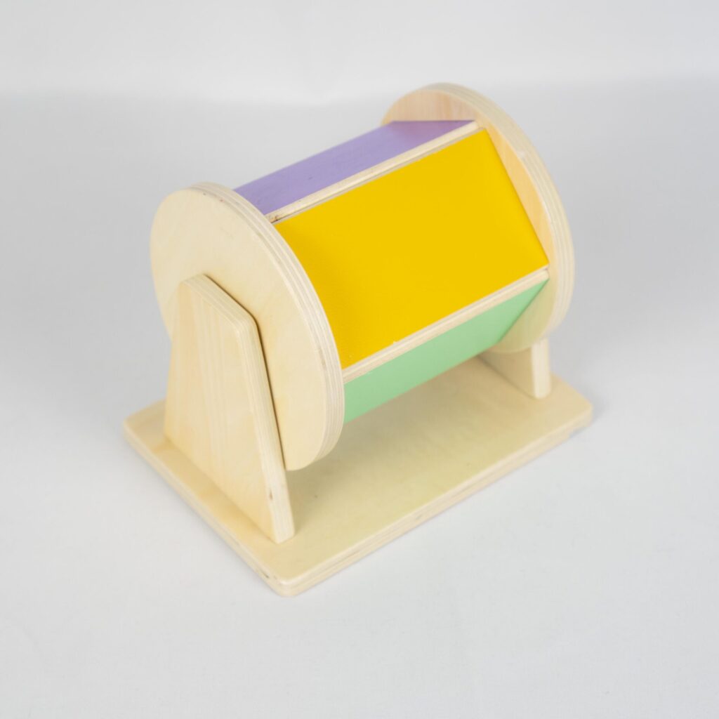 A smooth wooden drum with pastel-coloured panels (yellow, green, purple) that spins easily when touched or pushed. Perfect for babies to explore motion and colour while strengthening arm coordination during tummy time or sitting play.