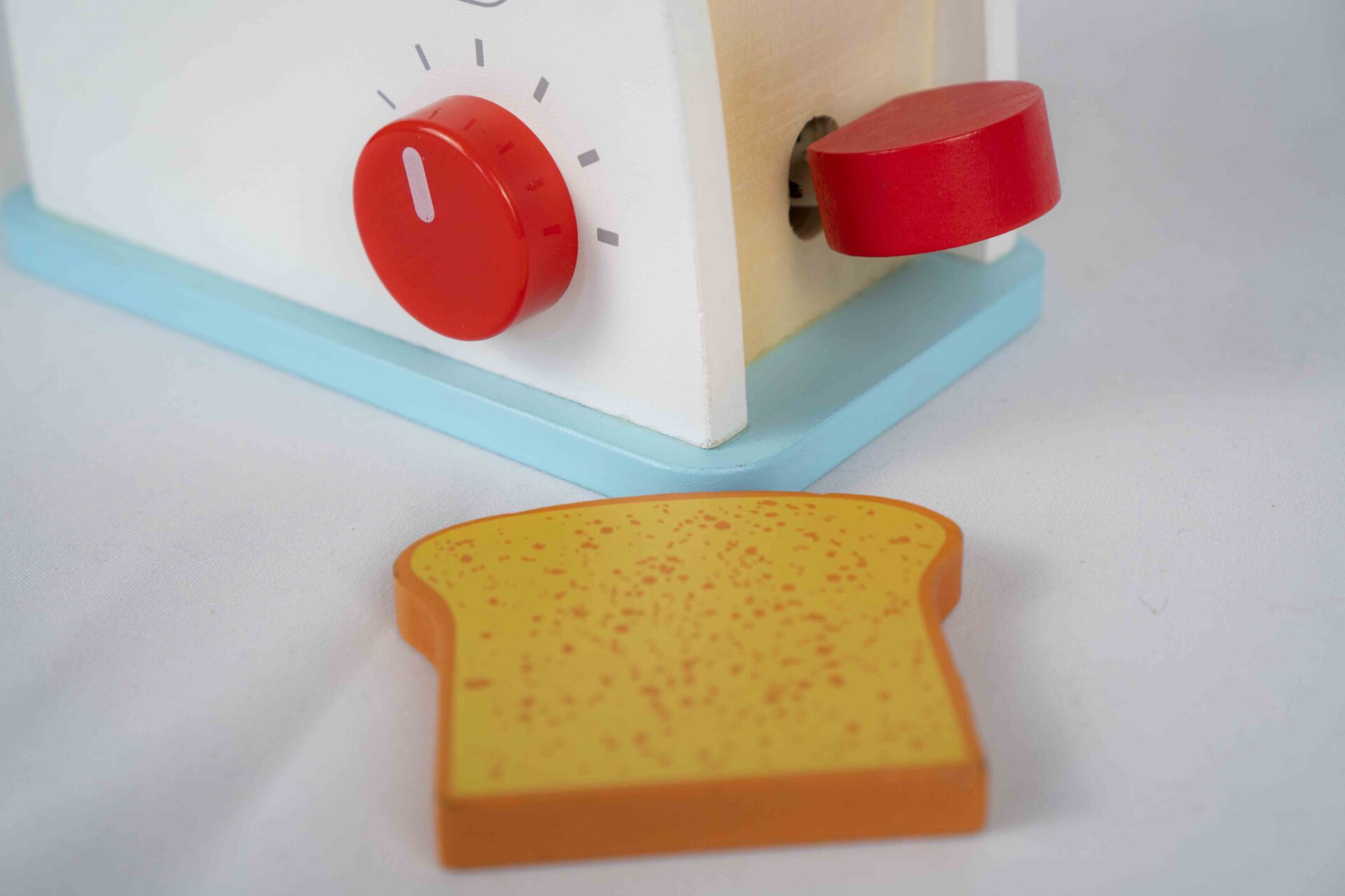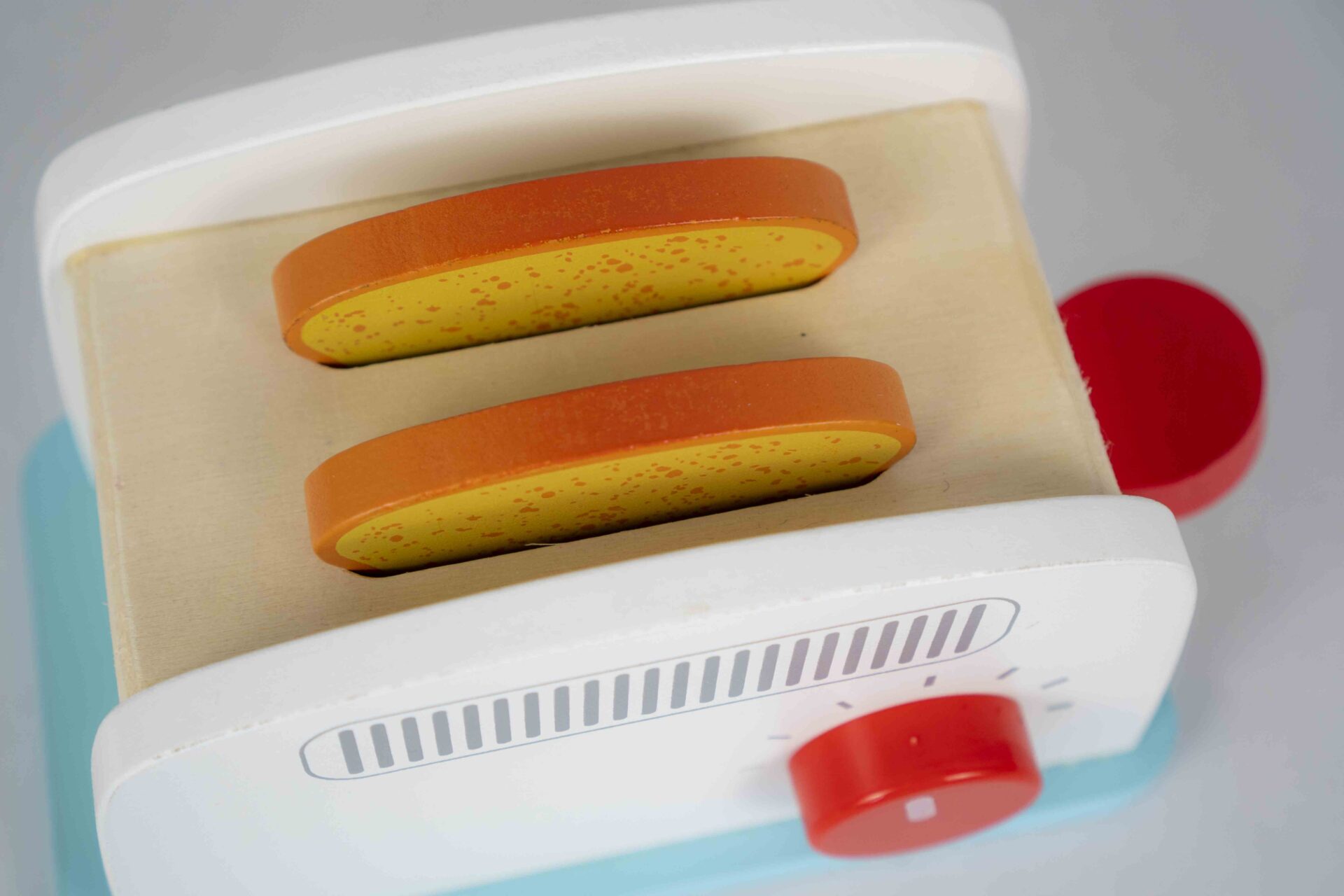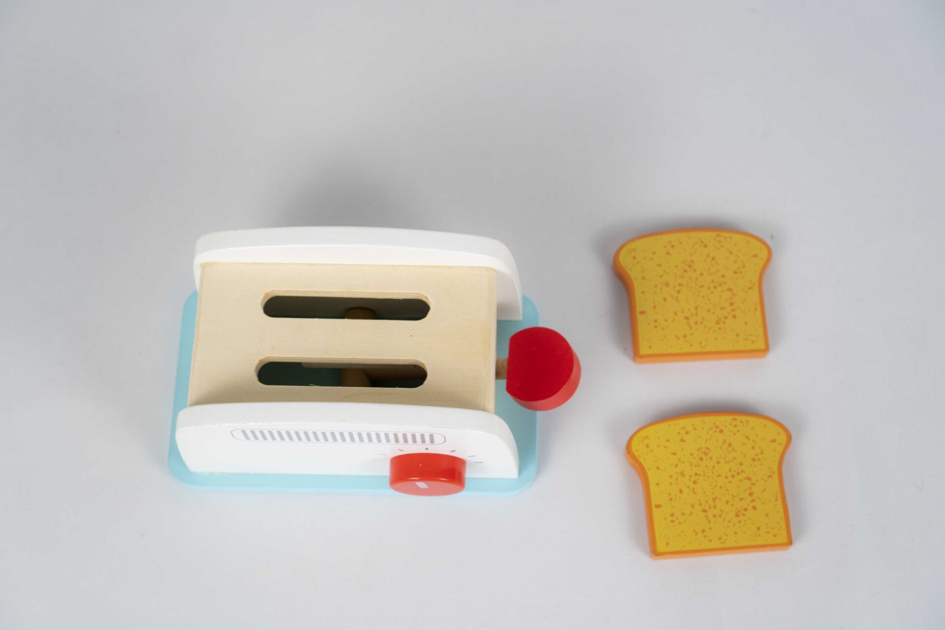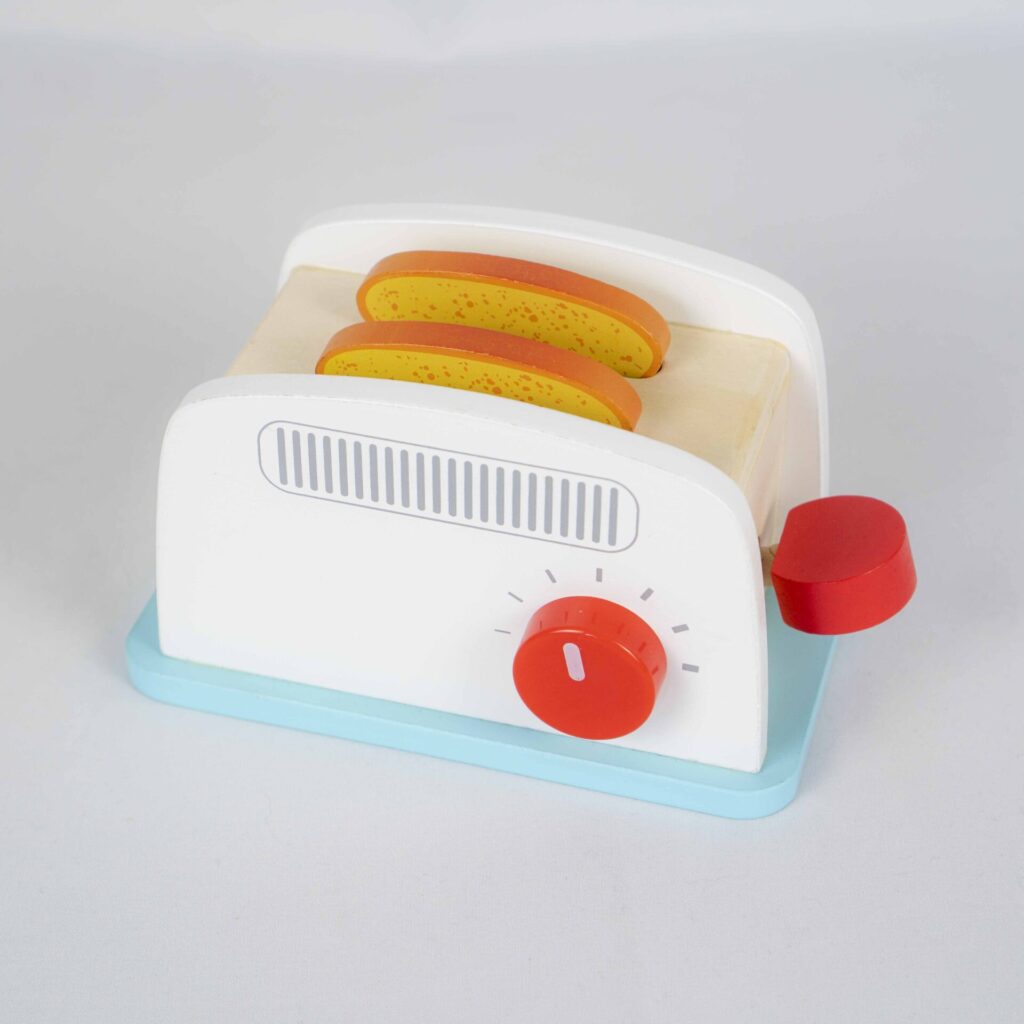 A charming white-and-blue wooden toaster with two toast slices and a turning dial. The lever makes the toast “pop” up just like a real one! Ideal for pretend play in the kitchen.